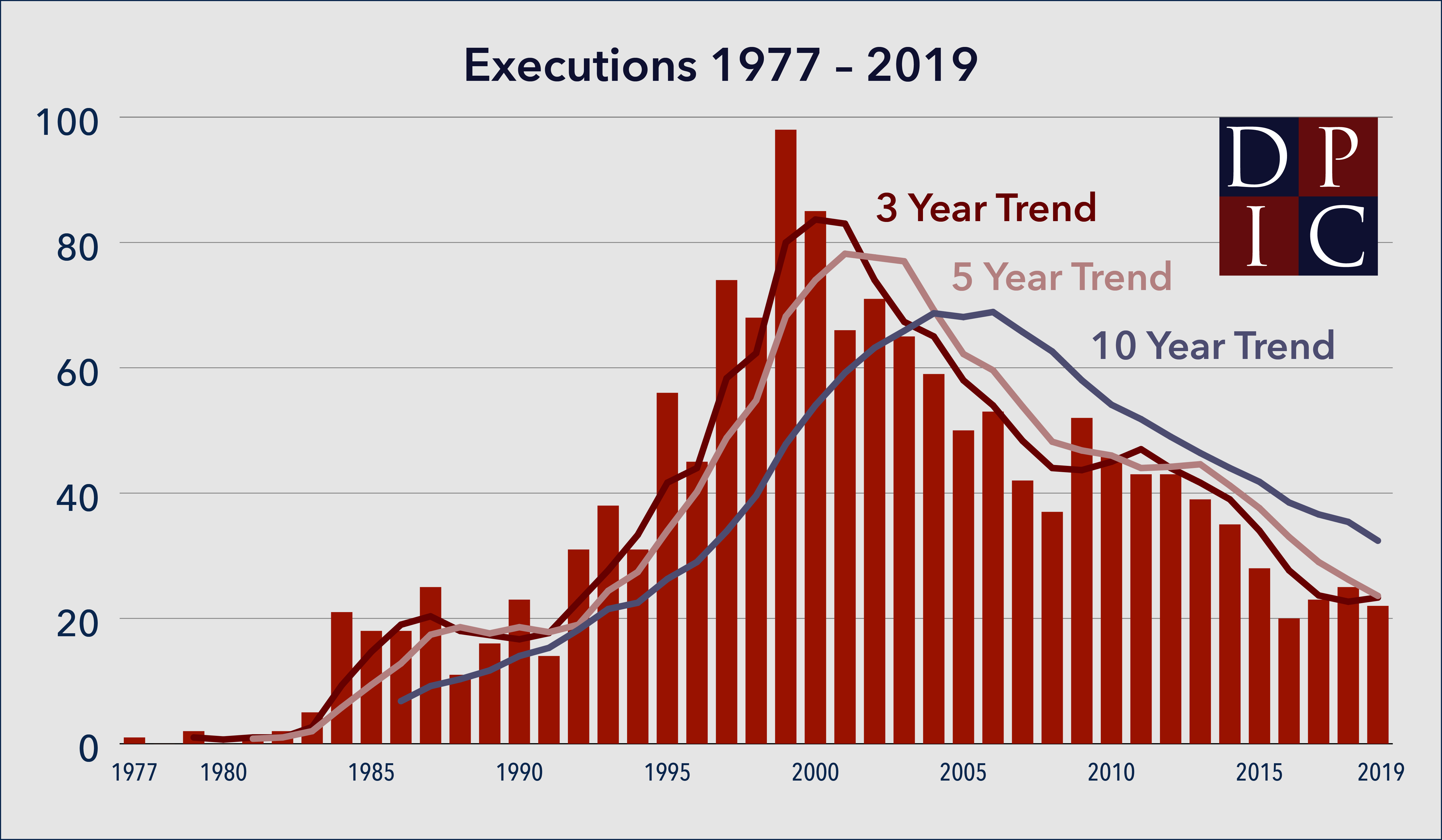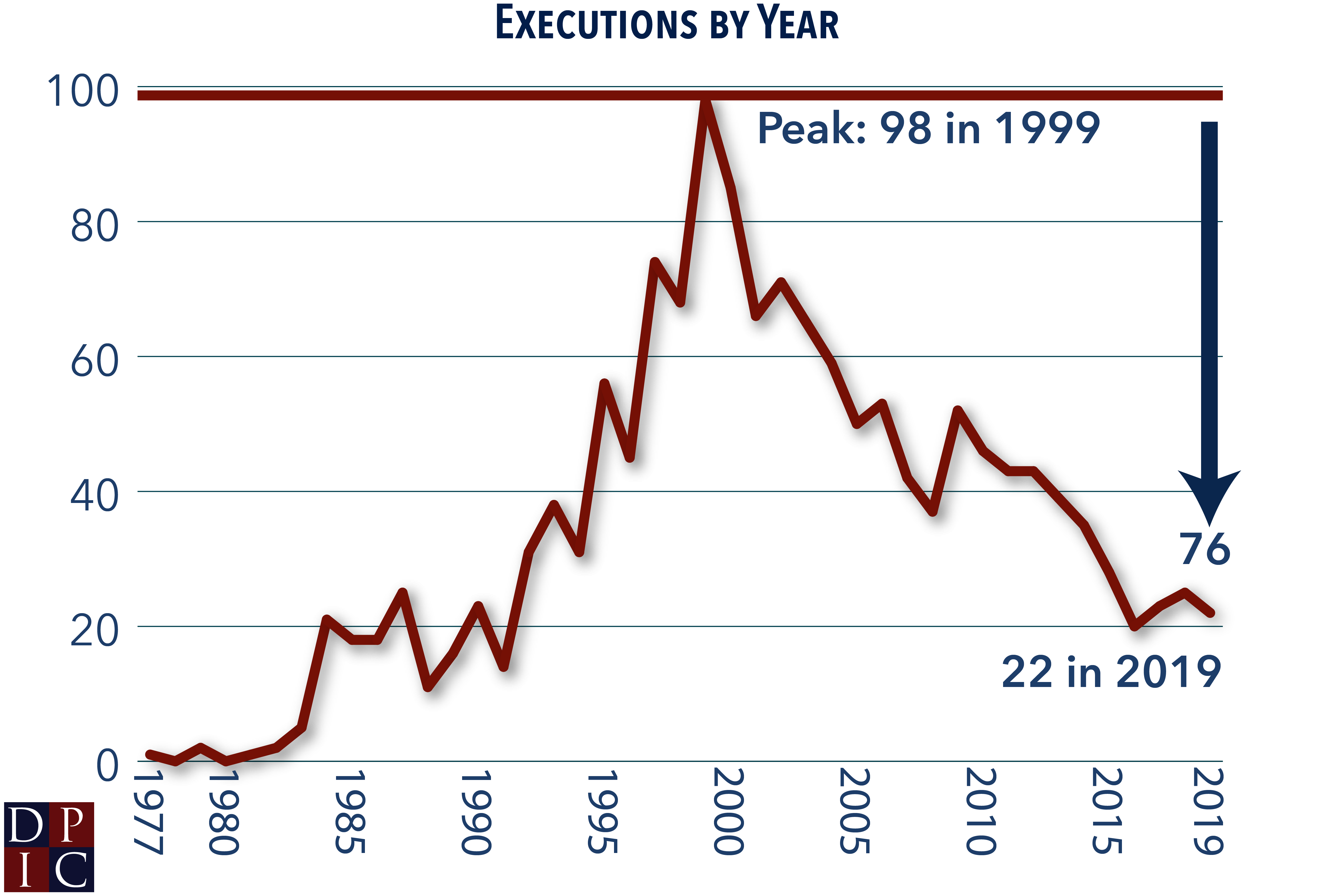 States carried out 22 executions in 2019, the second fewest in 28 years. The only year since 1991 in which states conducted fewer executions was 2016, when 20 prisoners were put to death. Executions were more than 77% below the peak of 98 twenty years ago, and were down slightly from the 25 executions conducted in 2018.