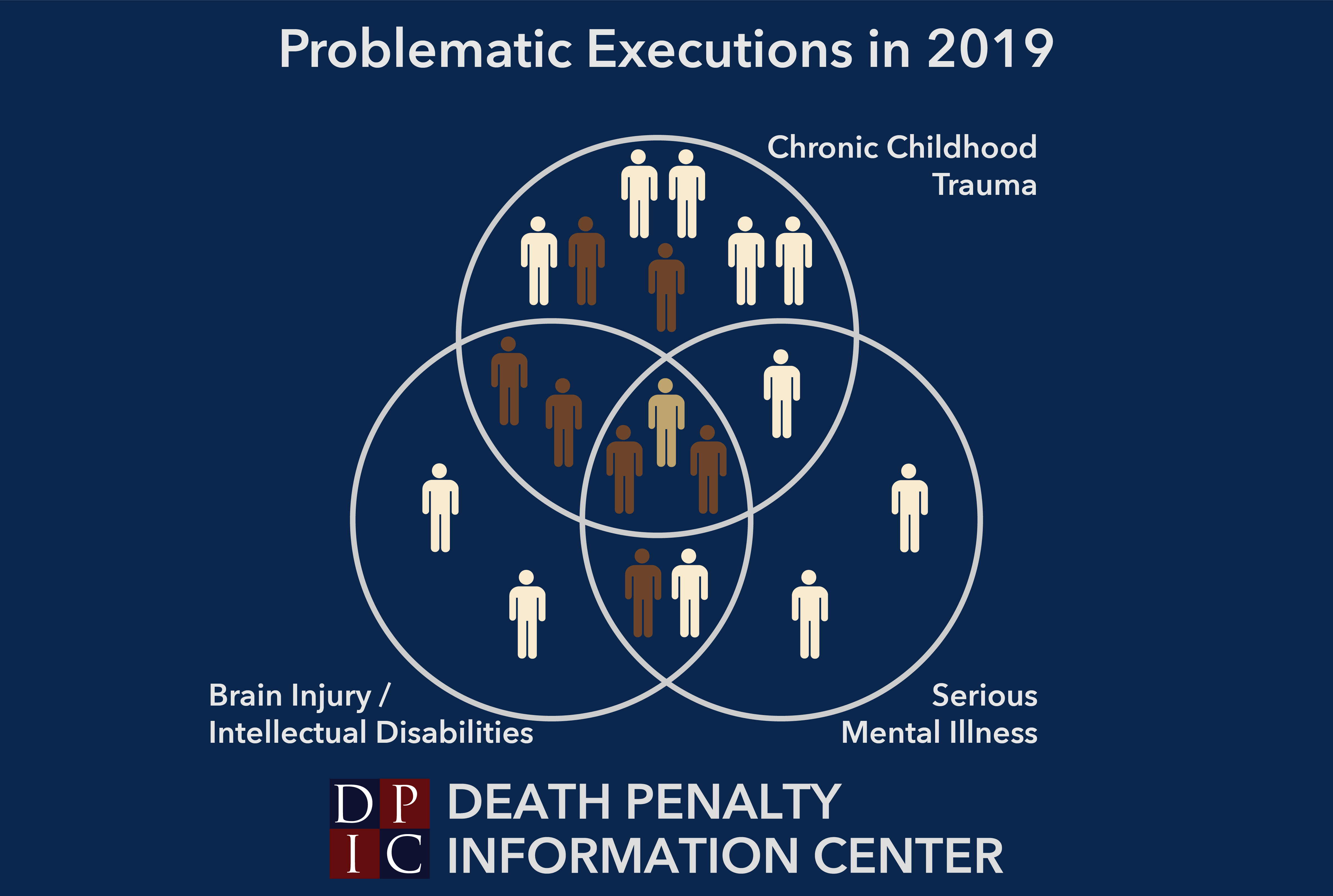 The executions in 2019 raised troubling issues of fairness and the persistent inability or unwillingness of states and the courts to limit capital punishment to the most serious murders and the most culpable defendants. At least 19 of the 22 prisoners who were executed this year had one or more of the following impairments: significant evidence of mental illness (9); evidence of brain injury, developmental brain damage, or an IQ in the intellectually disabled range (8); or chronic serious childhood trauma, neglect, and/or abuse (13). Many cases that resulted in execution in 2019 also involved faulty and insufficient legal process or flagrantly arbitrary outcomes. Once again, this year’s executions did not represent the “worst of the worst” crimes and offenders, but the most vulnerable defendants and those whose trials and appeals were the least reliable.