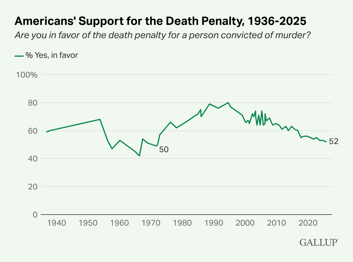 According to October 2025 polling produced by Gallup, public support for the death penalty has fallen to a five-decade low. Overall, Gallup found 52% of Americans in favor of the death penalty — down one percentage point from 2024’s number of 53%. Support for the death penalty in the modern death penalty era has been declining since 1994, when support reached a high of 80%. This year’s number is the lowest since 1972, the same year the U.S. Supreme Court invalidated capital punishment statutes nationwide, when only half of respondents were in favor of the death penalty. Gallup also found that 44% of Americans now oppose the death penalty — the highest level of opposition recorded since May 1966. Opposition to capital punishment has been increasing since the 1990s, and has more than tripled since 1995, when only 13% of Americans opposed the death penalty.
