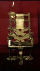 For execution by the electric chair, the person is usually shaved and strapped to a chair with belts that cross his chest, groin, legs, and arms. A metal skullcap-shaped electrode is attached to the scalp and forehead over a sponge moistened with saline. The sponge must not be too wet or the saline short-circuits the electric current, and not too dry, as it would then have a very high resistance. An additional electrode is moistened with conductive jelly (Electro-Creme) and attached to a portion of the prisoner’s leg that has been shaved to reduce resistance to electricity. The prisoner is then blindfolded. (Hillman, 1992 and Weisberg, 1991)