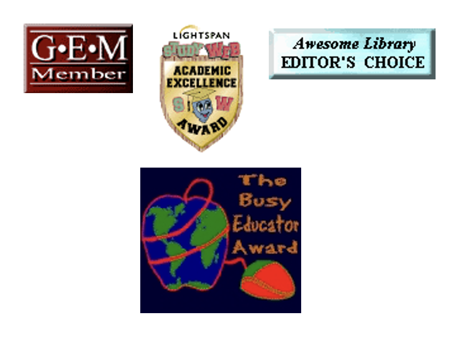 The site was reviewed and selected as a member of the GEM Gateway Consortium of Internet-based educational materials, received a 5 star rating from Pacific Bell’s Blue Web’n Library of Educational Resources, as well as a Lightspan StudyWeb award, and Awesome Library Editor’s Choice recognition as being among the top 5% of educational sites on the web, and a Busy Educator Award.