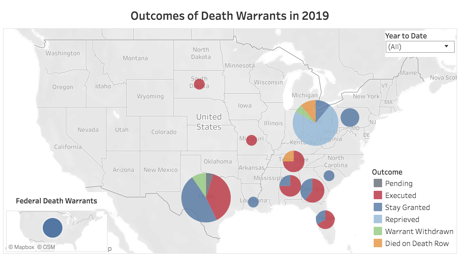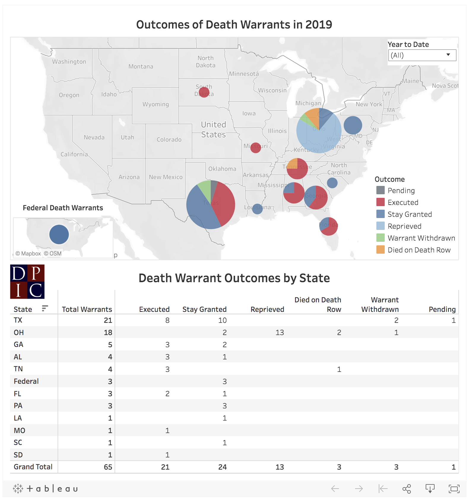 DPIC Analysis: With the U.S. Supreme Court’s February 6 ruling denying the Department of Justice’s application to vacate the federal-execution injunctions, more death warrants will have been blocked by stays of execution or judicial injunctions in 2019 than will have been carried out. As of December 8, DPIC was aware of 65 death warrants issued by 11 states and the federal government that scheduled execution dates for 2019. Courts have stayed or enjoined 24 of those warrants, while 21 executions have been carried out. One death warrant is still pending. 13 other scheduled executions have been halted by reprieve, 3 were rendered moot by the prisoner’s death while still on death row, and 3 other warrants were withdrawn.