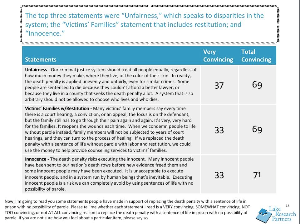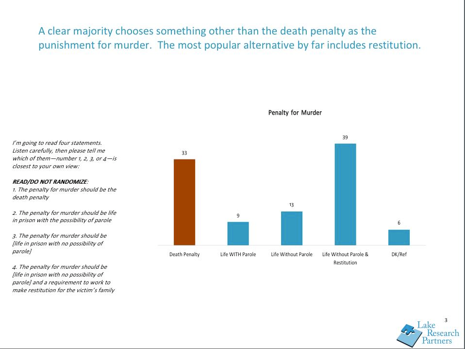 “We see a real openness to considering life with no possibility for parole as a punishment for murder and a real awareness among Americans of the many problems with the death penalty. It is likely we will see Americans moving away from support for the death penalty as states and local governments grapple with tight budgets and as today’s younger voters and Latinos move into the core of the electorate,” said pollster Celinda Lake.