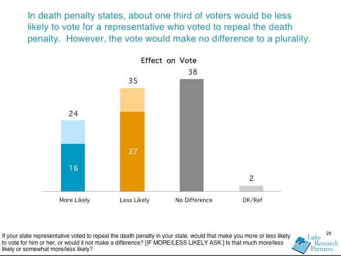 In states with the death penalty, a plurality of voters said it would make no difference in their vote if a representative supported repeal of the death penalty; and a majority (62%) said either it would make no difference (38%) or they would be more likely to vote for such a representative (24%).