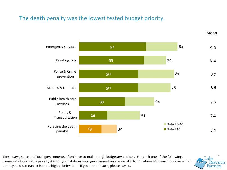 - Costs emerged as an important concern for a strong majority of Americans. Sixty-eight percent said cost was a very or somewhat convincing argument against the death penalty. Voters ranked emergency services, creating jobs, police and crime prevention, schools and libraries, public health care services, and roads and transportation as more important budget priorities than the death penalty.