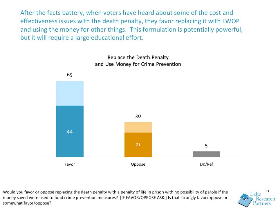 - A strong majority of respondents (65%) would favor replacing the death penalty with life with no possibility of parole if the money saved were used to fund crime prevention programs.