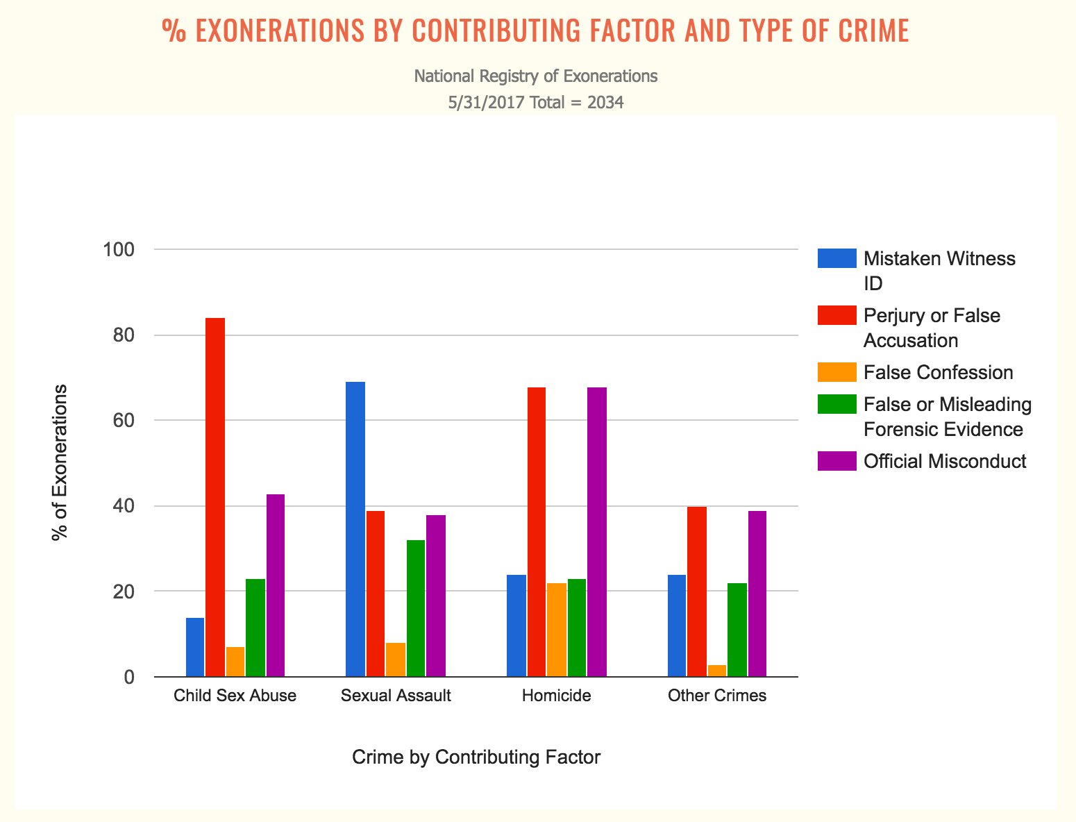 Data from the National Registry shows that official misconduct and false confessions are far more prevalent in homicide exonerations than in exonerations for other types of crimes, and that, apart from child sexual abuse, homicide exonerations involve perjury or false accusation much more frequently than do exonerations in other types of cases. Mistaken eyewitness identifications and false or misleading forensic evidence are present to the same degree in homicide cases as is most other types of cases. The exception is exonerations in sexual assault cases, which have significantly higher rates of both mistaken identifications and false or misleading forensic evidence.