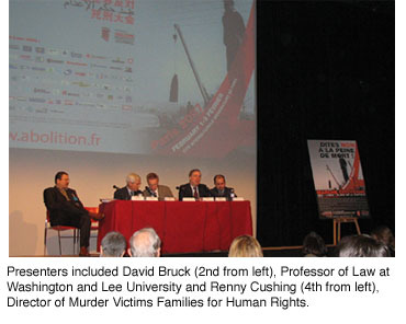 The Third World Congress Against the Death Penalty took place in Paris from February 1 – 3, 2007. During this time, Paris welcomed hundreds of death penalty experts and activists from around the world, including numerous U.S. representatives who provided a broad overview of capital punishment trends in the U.S. Among the American panelists who participated in the Congress were:
