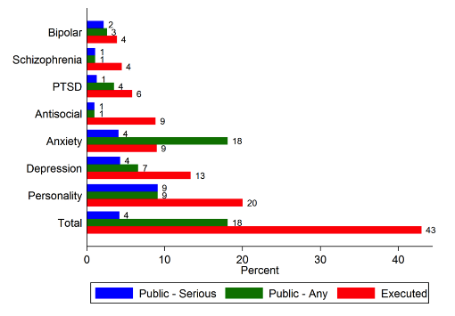Four percent of Americans have been diagnosed with a serious mental illness. Personality disorders and depression were the most commonly diagnosed illnesses among those executed, but executed death-row prisoners also had significantly higher rates of such serious disorders as schizophrenia, posttraumatic stress disorder, and bipolar disorder.