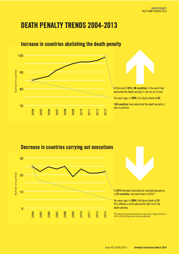 Amnesty International recently released its annual report on capital punishment around the world, noting, “Developments in the worldwide use of the death penalty in 2013 confirmed that its application is confined to a small minority of countries.” As illustrated in the chart at left, over the past decade there has been an increase in the number of countries abolishing the death penalty and a decrease in countries carrying out executions. Because executions in China remain a state secret, Amnesty was not able to determine the number of executions worldwide. Of the known executions, almost 80% occurred in just three countries: Iran, Iraq, and Saudi Arabia. Twenty-two countries recorded executions last year. No executions were carried out in Europe or Central Asia. The United States remained the only country in the Americas to carry out executions and had the fifth most executions of any country in the world. (Information from Syria and Egypt could not be confirmed.)