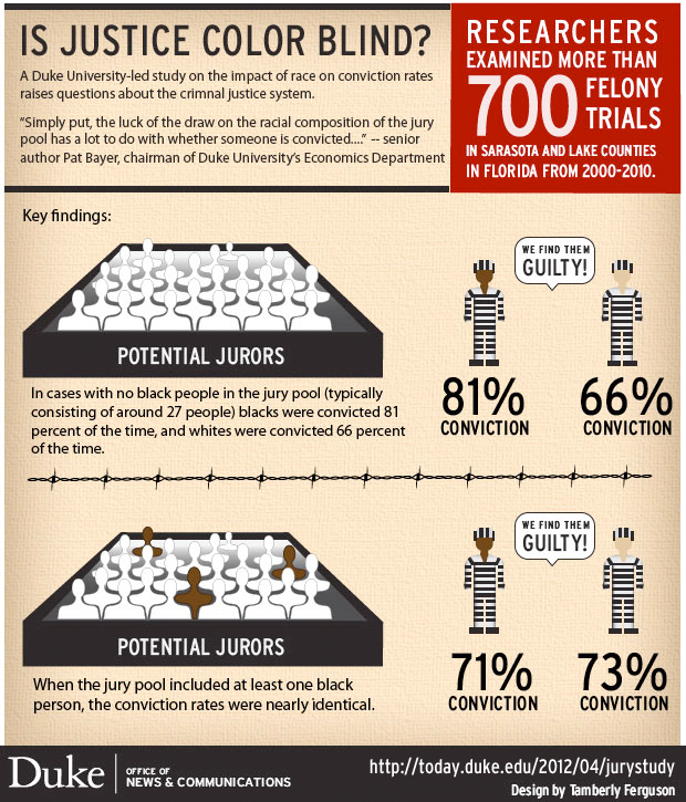 (S. Hartsoe, Study: All-White Jury Pools Convict Black Defendants 16 Percent More Often Than Whites,” Duke Today, April 17, 2012; post­ed May 7, 2012; The Impact of Jury Race in Criminal Trials,” senior author Patrick Bayer, Duke University; Shamena Anwar, Carnegie Mellon University; Randi Hjalmarsson, Queen Mary, University of London. Quarterly Journal of Economics, online April 17, 2012, print in May 2012; DOI num­ber 0.1093/QJE/QJS014).
