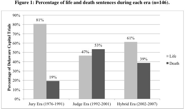 (Click left image to enlarge). A new study by researchers at Cornell University examined the effects of Delaware’s decision to transfer capital sentencing authority from the jury to the judge at trial. The study used data from capital cases between 1977 and 2007, during which time Delaware made the shift to judge sentencing – one of very few states to employ that procedure. According to the study, “Judges were significantly more likely to give a defendant the death sentence than were juries.” During the era when Delaware relied on juries for sentencing, about 20% of capital cases resulted in death sentences. In the era when it relied solely on judges, 53% of the cases were given death sentences. Today, the state has a hybrid model in which a jury must unanimously find the existence of at least one aggravating factor beyond a reasonable doubt to make a case death eligible. The jury then makes a sentencing recommendation to the judge, which is given appropriate consideration.