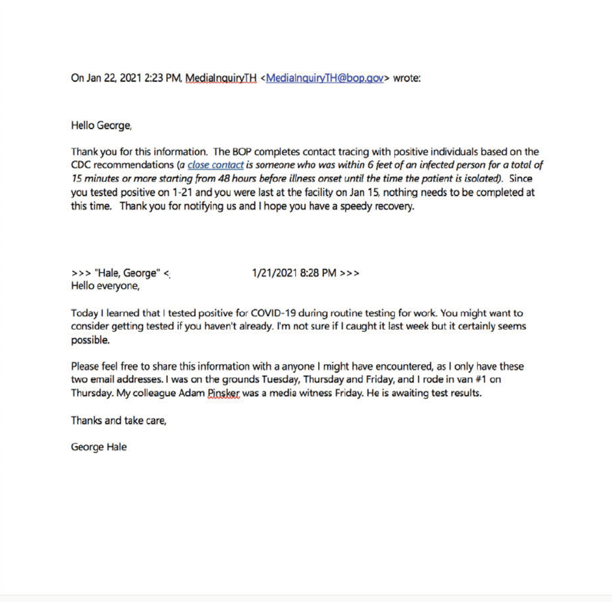 Hale sent his first email at 8:28 p.m. on January 21. The next afternoon, at 2:23 p.m., the BOP replied with an email stating, “Thank you for this information. The BOP completes contact tracing with positive individuals based on the CDC recommendations (a close contact is someone who was within 6 feet of an infected person for a total of 15 minutes or more starting from 48 hours before illness onset until the time the patient is isolated). Since you tested positive on 1 – 21 and you were last at the facility on Jan. 15, nothing needs to be completed at this time. Thank you for notifying us and I hope you have a speedy recovery.”