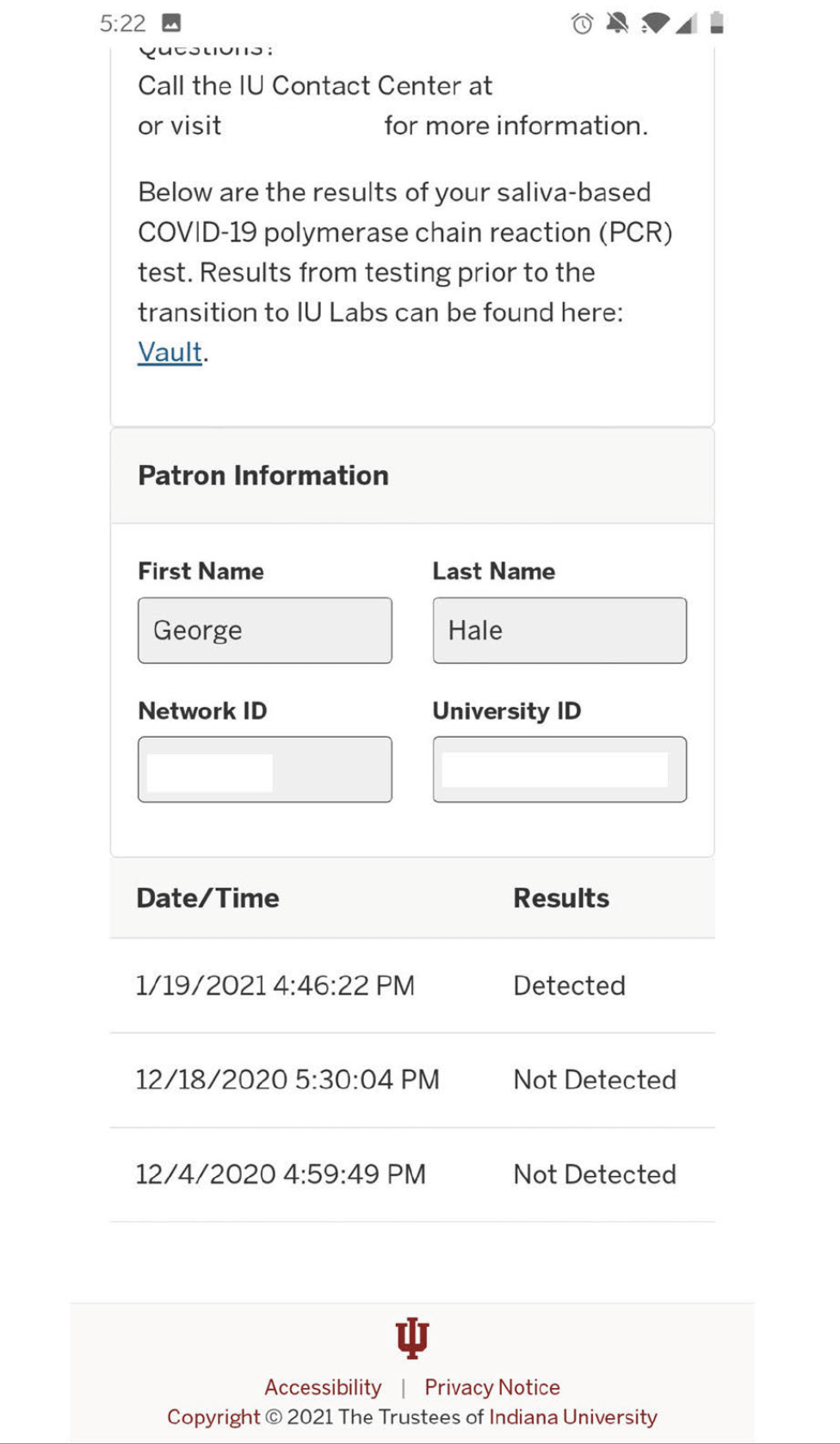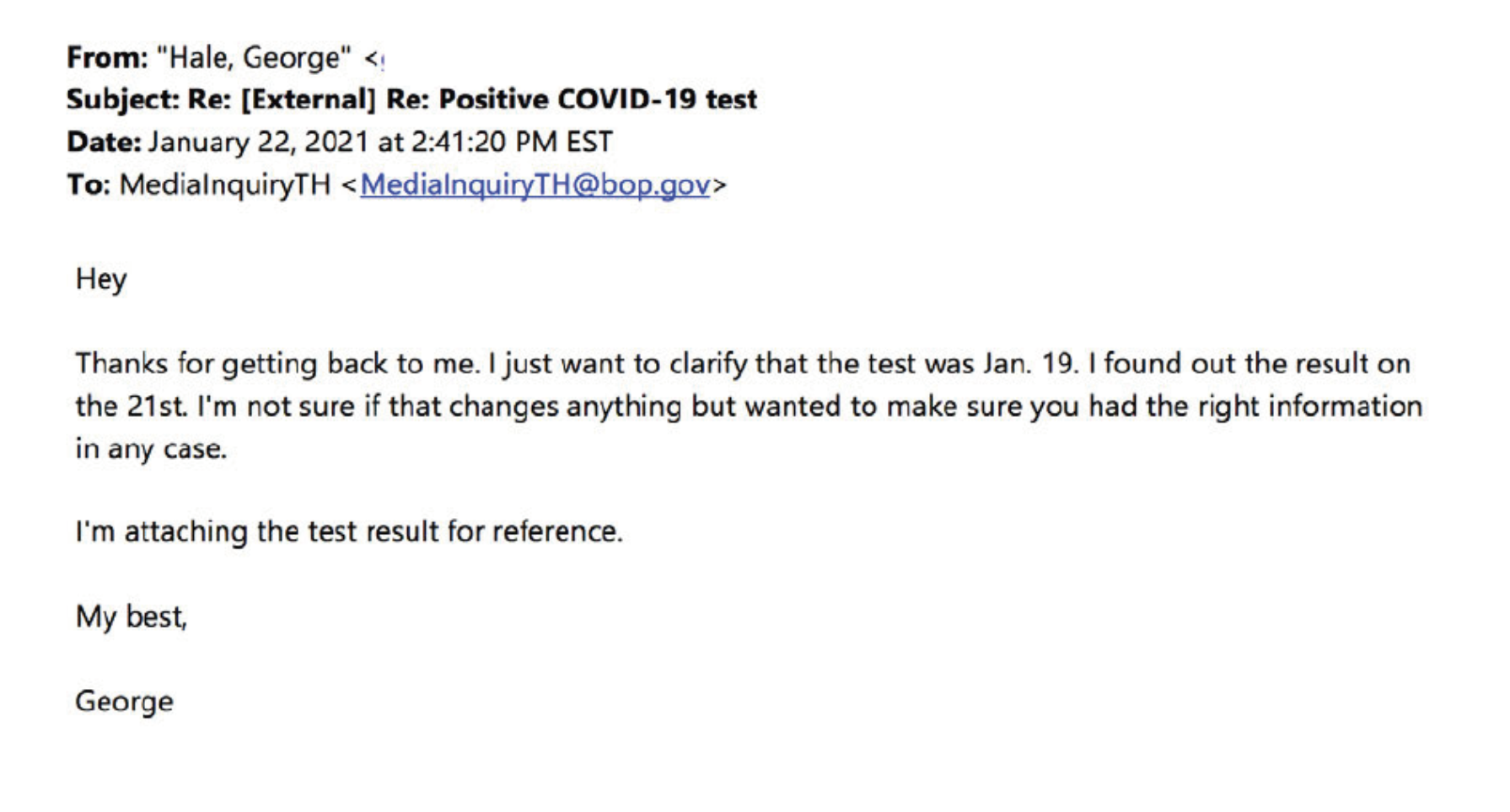Hale immediately responded with an email to BOP, sent at 2:41 p.m., clarifying that his COVID test had been administered on January 19 and that he had received the results on January 21. Hale attached a copy of the saliva-based COVID-19 polymerase chain reaction (PCR) test results to his email. The report indicated that the test had “detected” evidence of COVID-19.