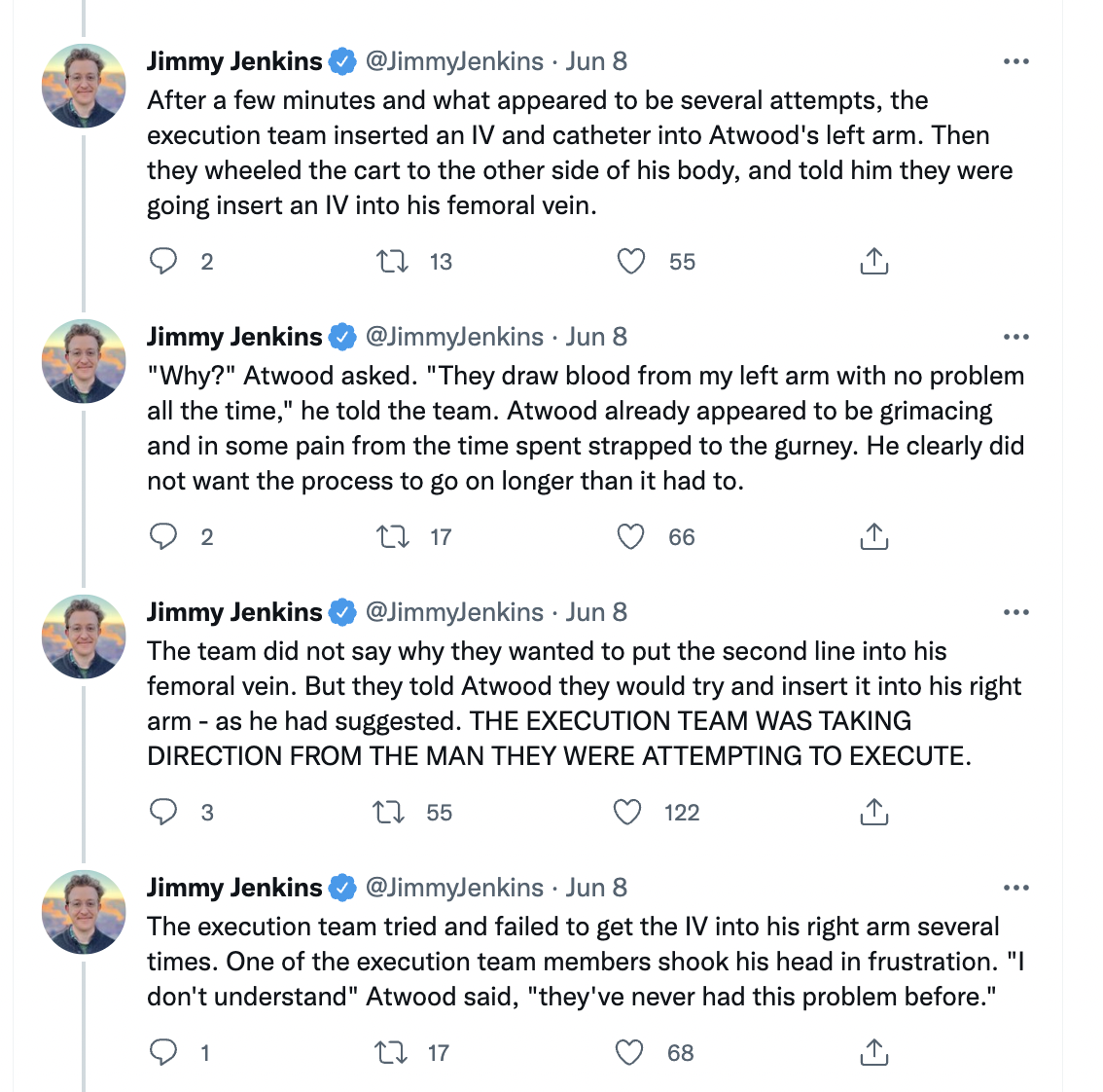 After the execution team again suggested placing the second IV into Atwood’s femoral vein, the condemned man suggested, “Could you try the hand? … They have been able to go in there before as well.” In a tweet after the execution expressing his astonishment, Jenkins wrote: “The IV team members looked at each other, looked at Atwood, looked at each other again, and said ‘Sure, we‘ll give that a try.’ ONCE AGAIN THE EXECUTION TEAM MEMBERS RELIED ON ADVICE FROM THE MAN THEY WERE TRYING TO EXECUTE.”